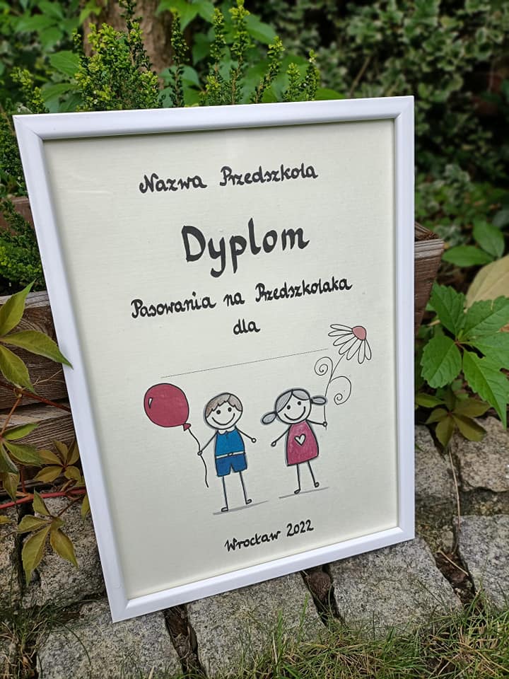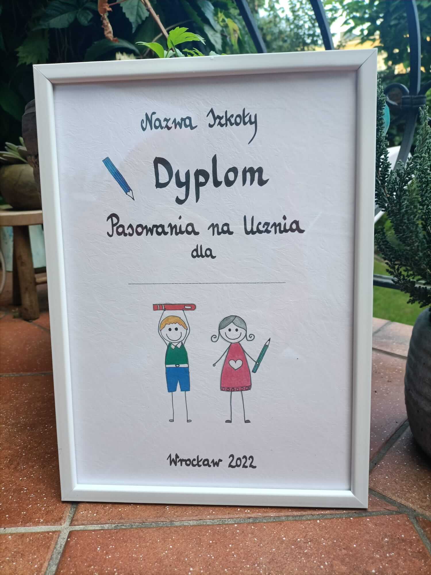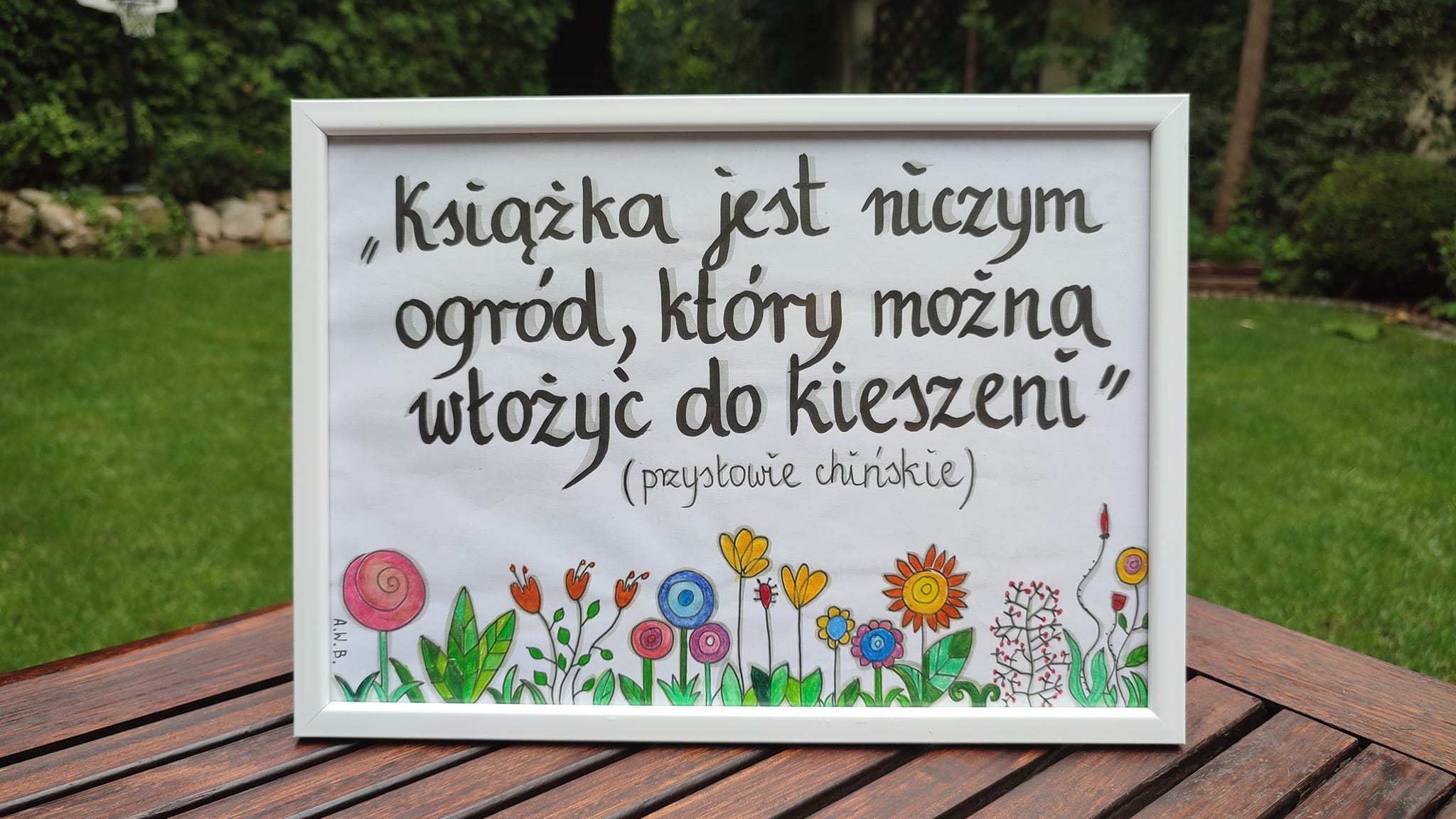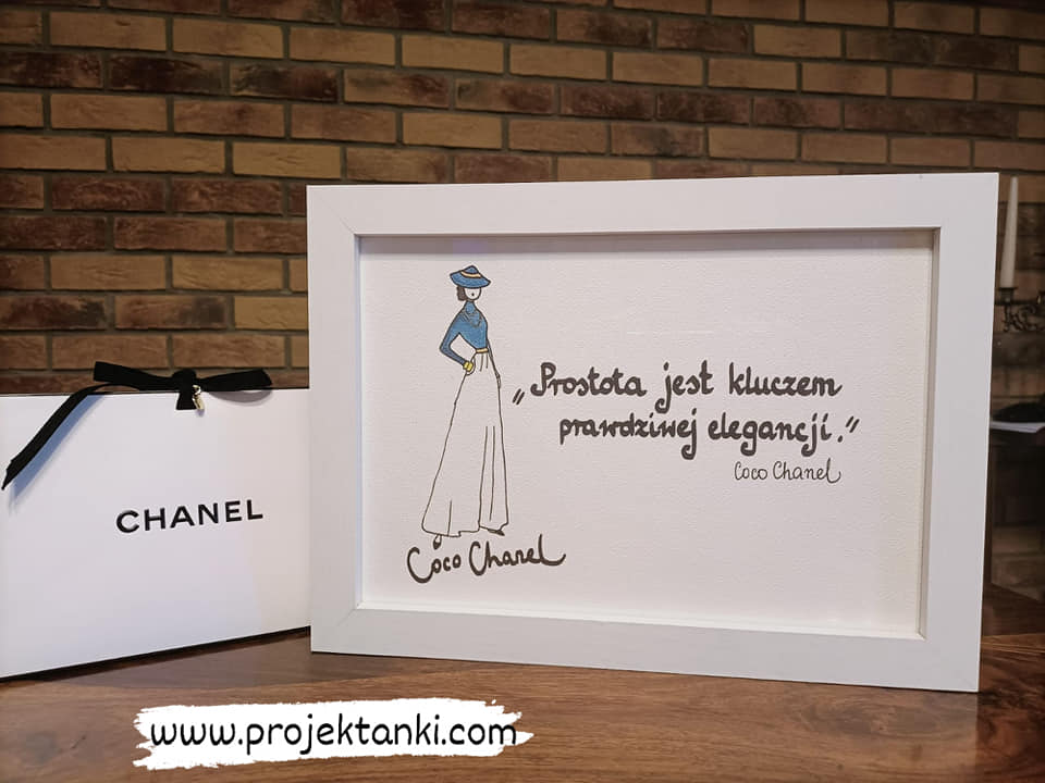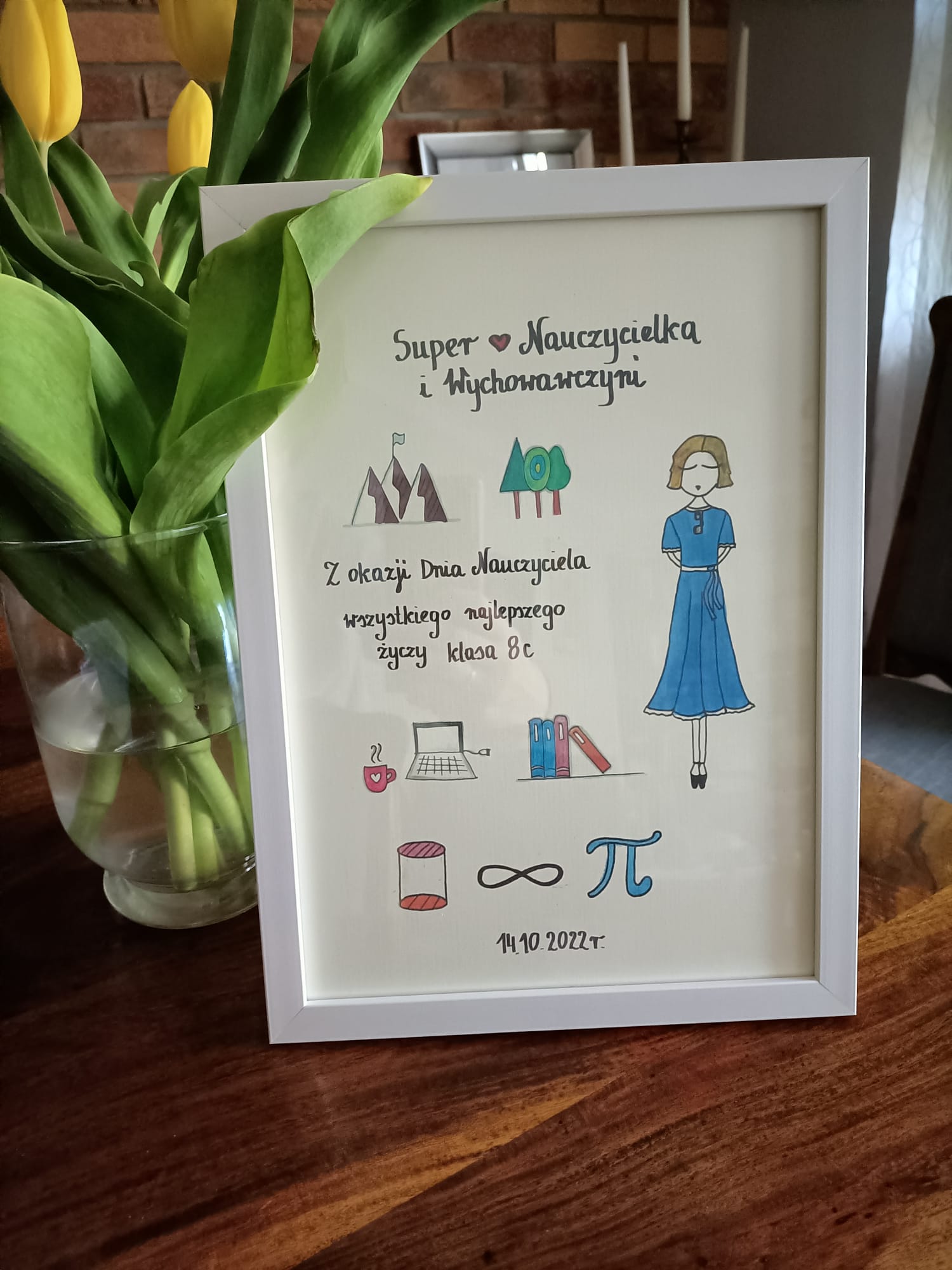 Kartka jednostronna oprawiona w ramkę ze szkłem.