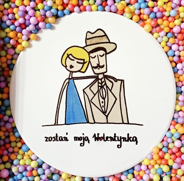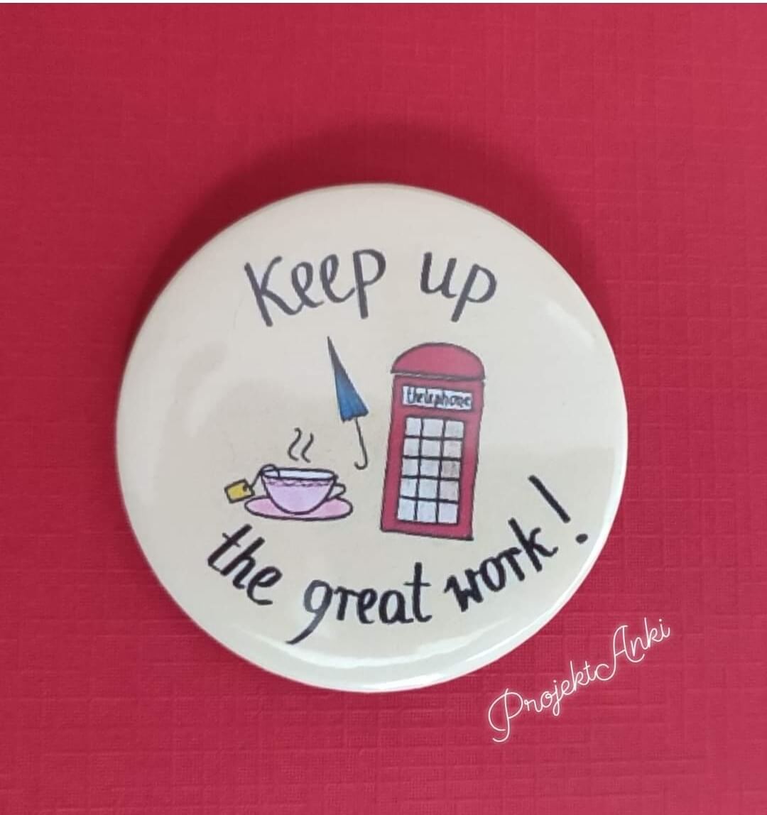 Przypinki i magnesy z dowolną grafiką wykonaną ręcznie według autorskiego projektu na życzenie klienta. Średnica 59 mm.