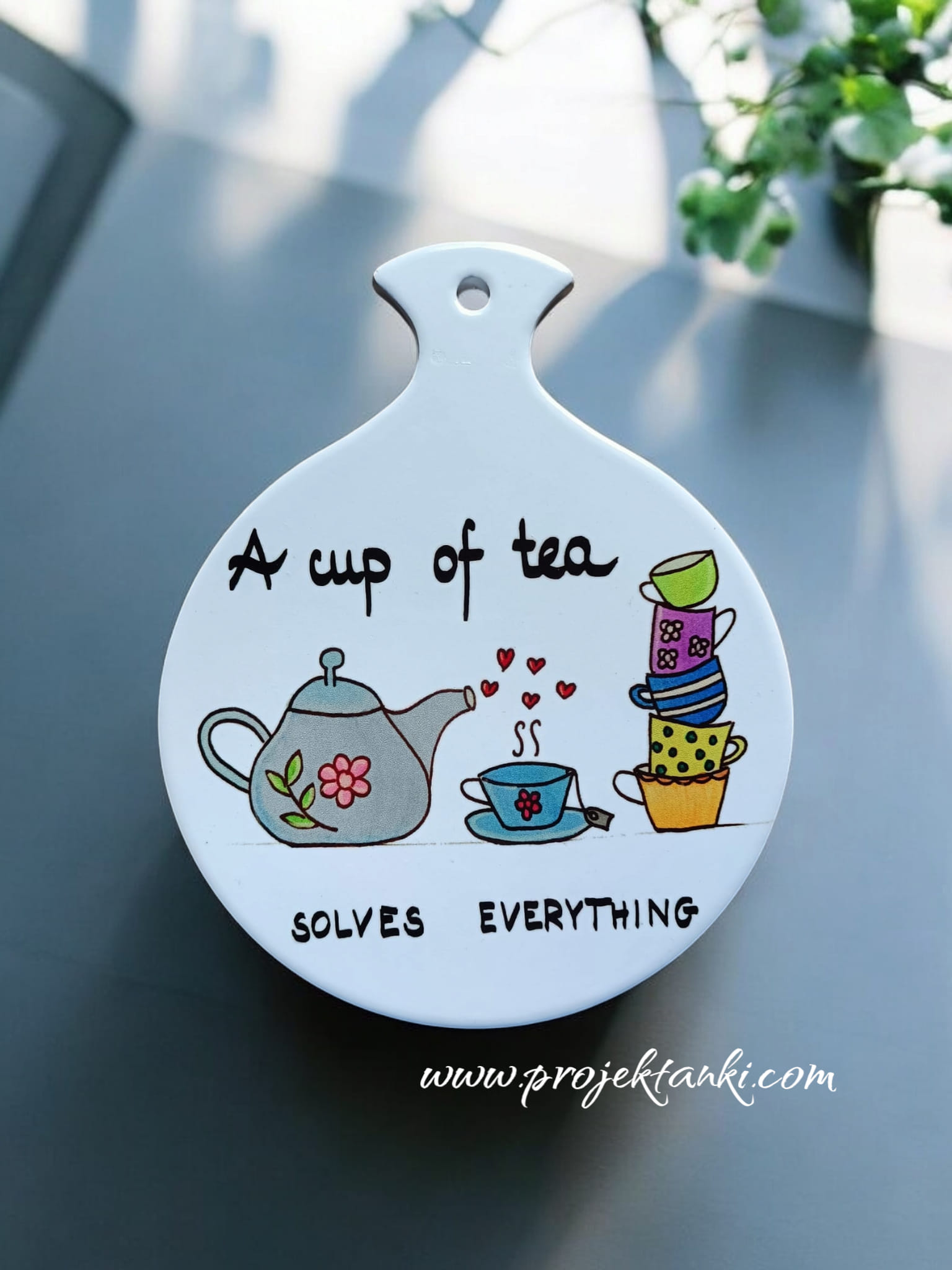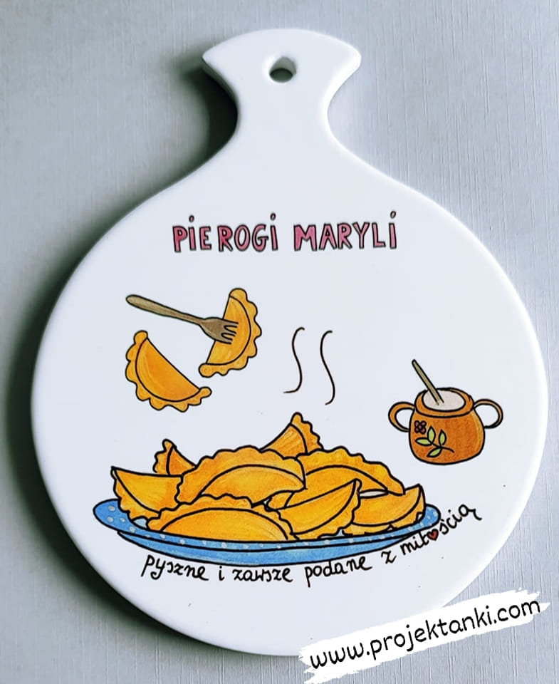 Ceramiczna podkładka pod gorące naczynie z korkowy spodem. Podkładki z dowolną grafiką wykonaną ręcznie według autorskiego projektu na życzenie klienta. Wymiary: 150 x 190 mm.